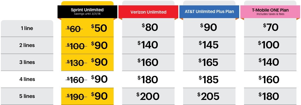 比较四大运营商无限流量套餐售价,Sprint 最低。