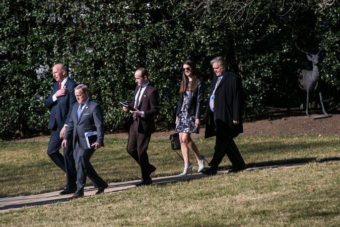 白宫的一群资深工作人员,最右为Stephen K. Bannon,他挑战传统的政治智慧,坚持让特朗普的竞选团队保持紧凑和分散。