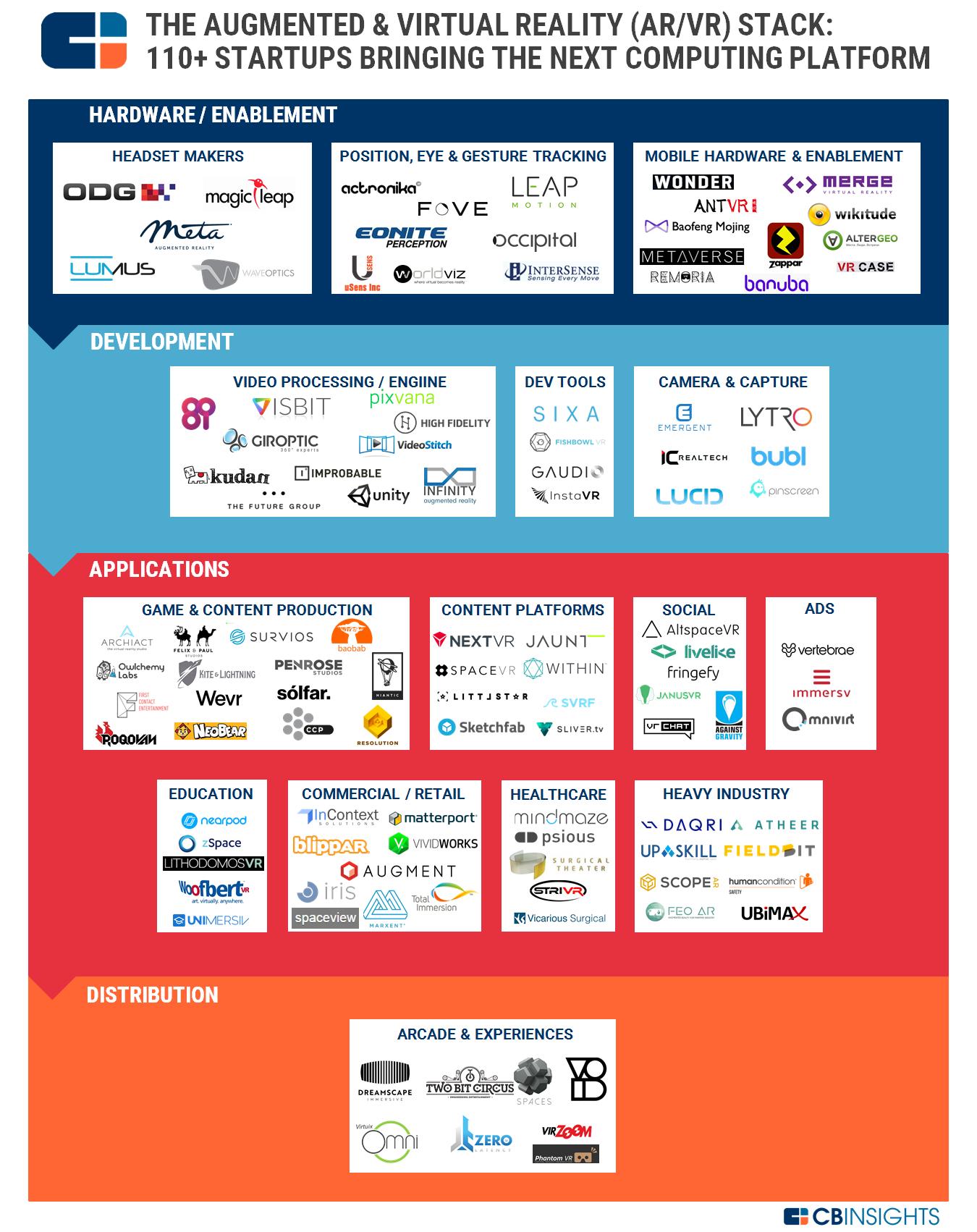 CB Insights 绘制了AR / VR产业的创业公司堆栈地图,以全新的方式对该领域的初创企业进行了分类。