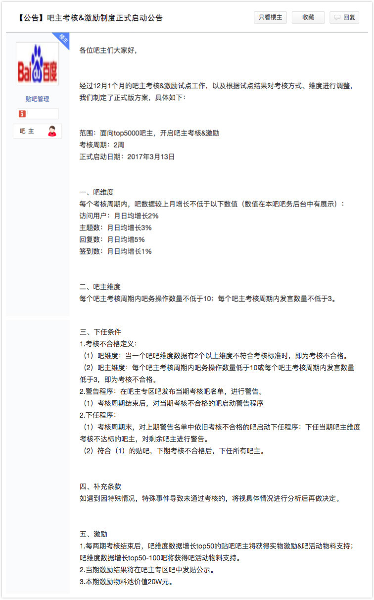 往前看,这件事情是这样的,此前百度贴吧吧主专区吧发布了一则《吧主考核&激烈制度正式启动》正式公告。在公告中,明确规定了公告的试用范围是面向top5000吧主,考核周期为2周,并于今年3月13日正式开始。