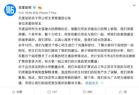 百度贴吧宣布停止激励考核新规,公告原贴已被删除
