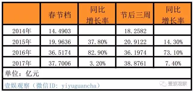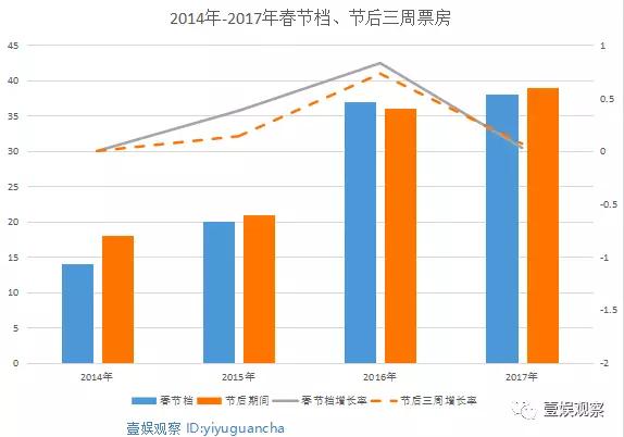 接下来,壹娱观察(微信ID:yiyuguancha)将分析2014—2017四年春节档及节后的三个自然周(下文简称“节后三周”)的票房表现。