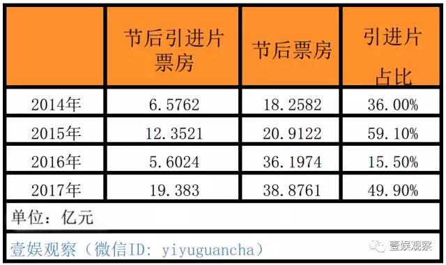2017年,引进片在节后票房占比达到了49.9%。可以说,在今年节后票房7.4%的增长率中,引进片的贡献份额占到了近一半,仅次于2015年的相应数据表现。换句话说,2017年节后三周国产片的表现与2016年和2014年的相应数据相比实在堪忧。