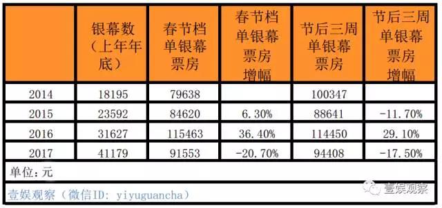 2014年-2017年春节档、节后三周的单银幕票房收入