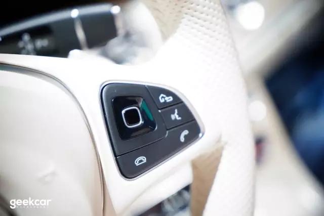 说回星脉。车辆熄灭的时候,它没有任何按钮图示显示。因为变成了虚拟的按键,所以交互动作可以更多,比如拇指上下滑动来切换音量,这个动作是模拟了实体按键里音量滚轮的操作模式,但是在这个操作里,虚拟触控的优势在于扩大了可操作面积。另外,星脉方向盘上的这两坨「多功能键」是可以按压的,这有利于提升操作时的触觉反馈。