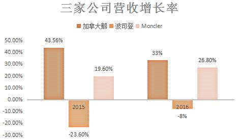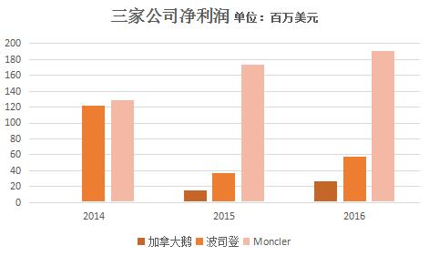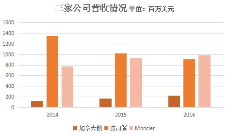 从营收上看,波司登的销售额曾经是最高的,但是从2014财年起一直走下坡路,在2016财年被Moncler超越,Moncler在截止至12月31日的2016财年,营收首度突破10亿欧元大关。加拿大鹅的营收规模还远及不上其他两个羽绒服品牌。