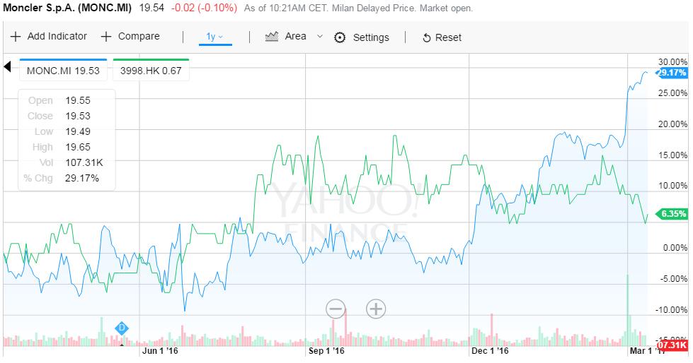 从股价方面可以看出,Moncler在近一年的时间内是处于上升的状态,而波司登不是很稳定上下波动。由于加拿大鹅被炒得太火了,所以蛮期待上市后,加拿大鹅的走势。