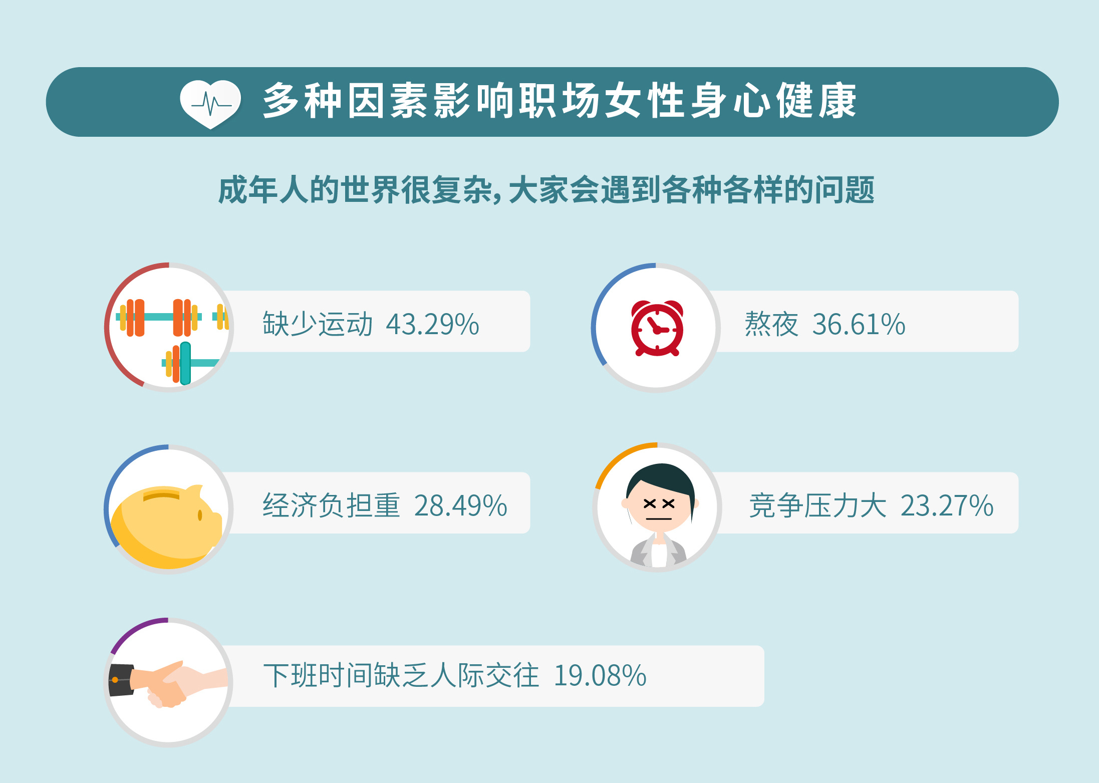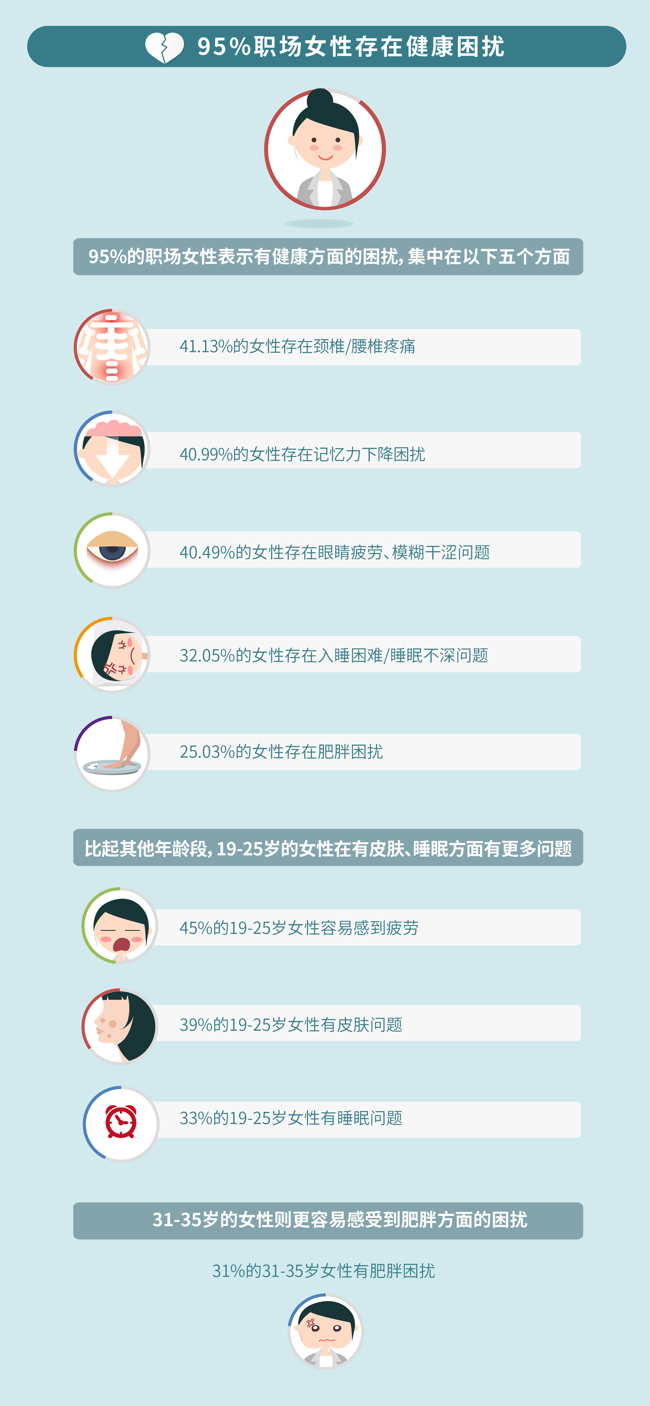 95%的职场女性表示有健康方面的困扰,集中在以下五个方面: