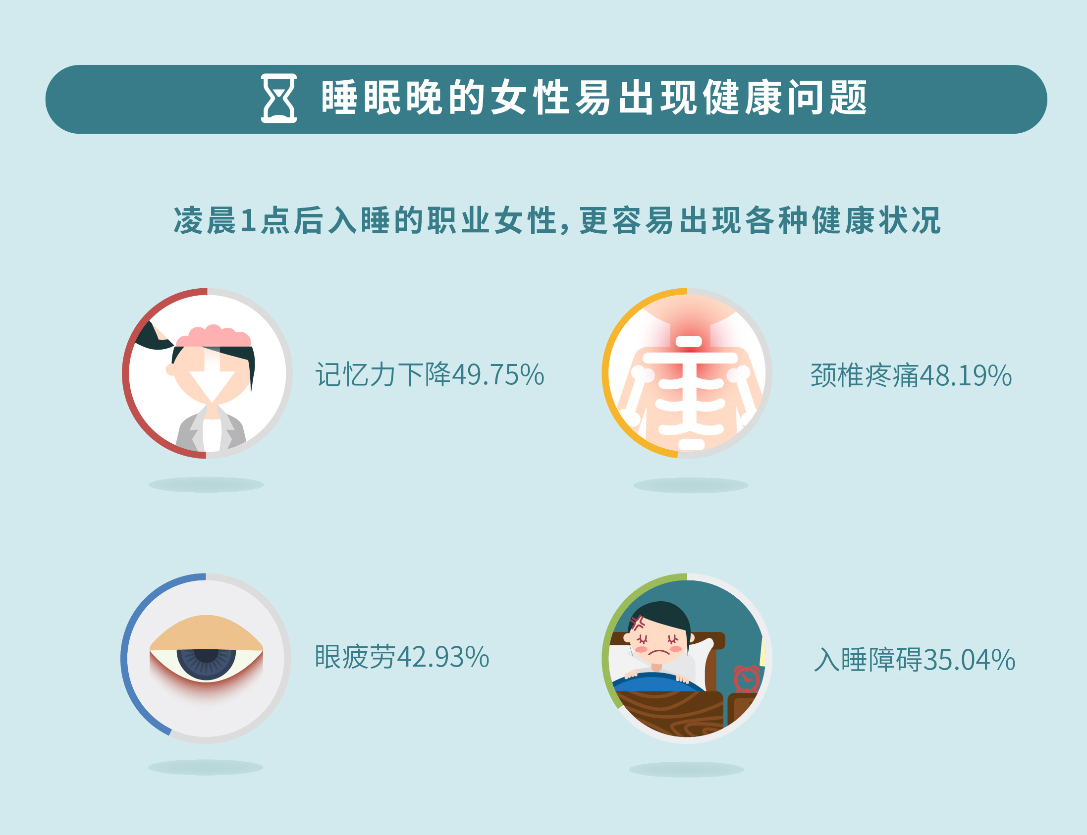 凌晨1点后入睡的职业女性,更容易出现各种健康状况: