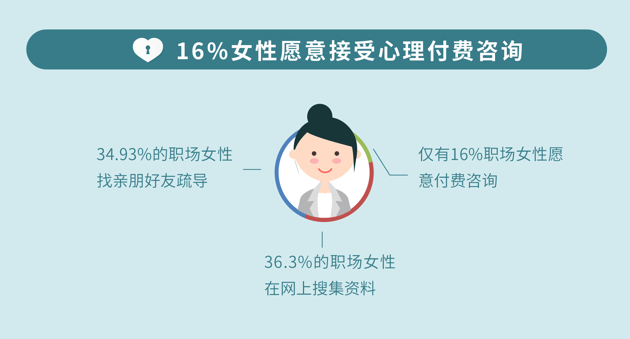 仅有15.46%职场女性愿意付费咨询心理问题,其中到线下医院就医的占据9.41%,到心理咨询诊室咨询的仅占据4.47%;