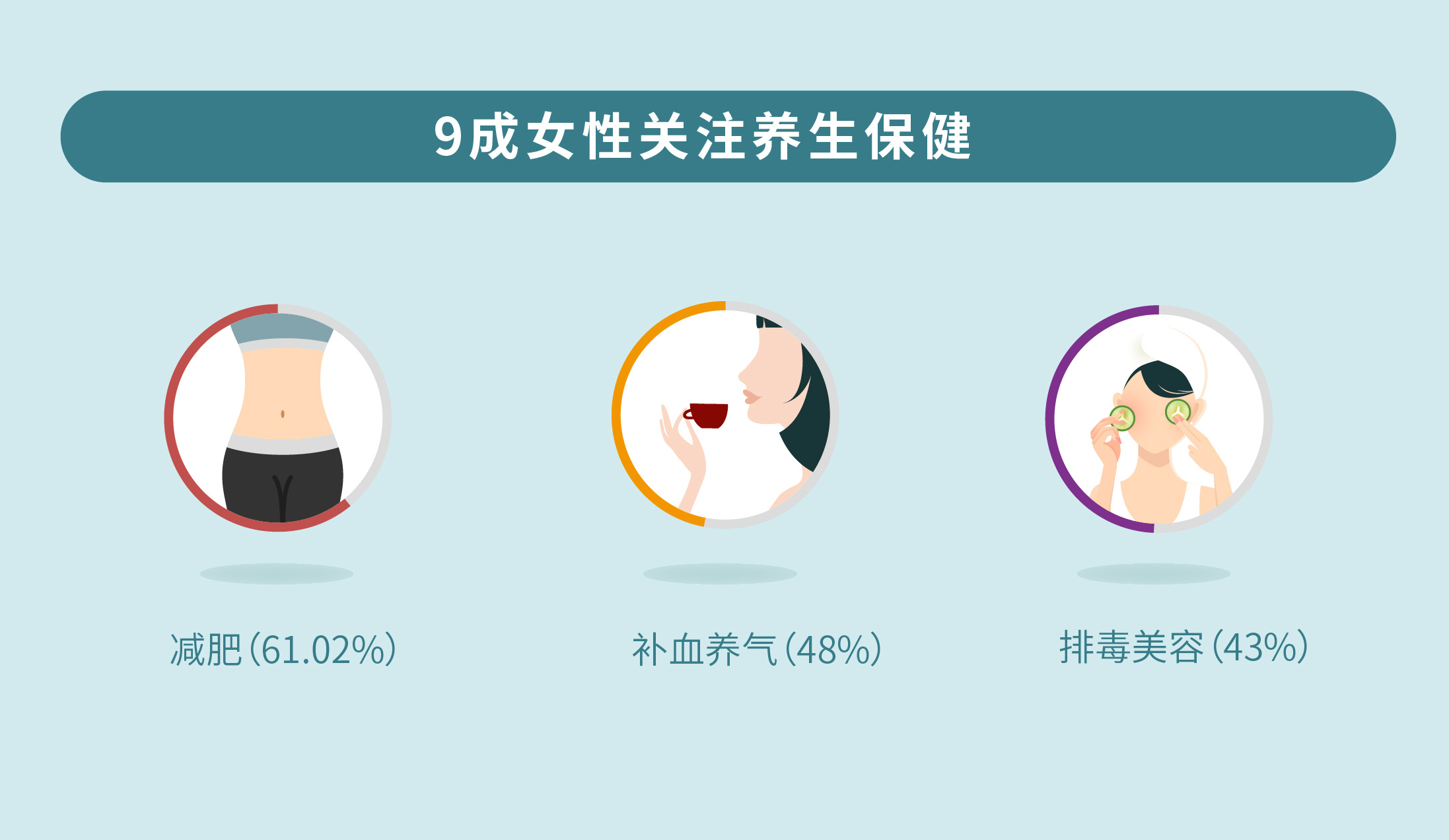 女人都是爱美的,9成女性关注养生保健方面的信息,主要关注的是补血养气(48%)和排毒美容(43%) ;比起其他年龄段,40岁以下更关注排毒美容,40岁以上更关注防治三高;比起其他年龄段,19-25岁的最关心腿部塑性。