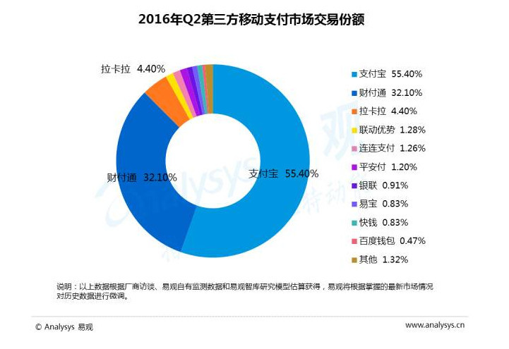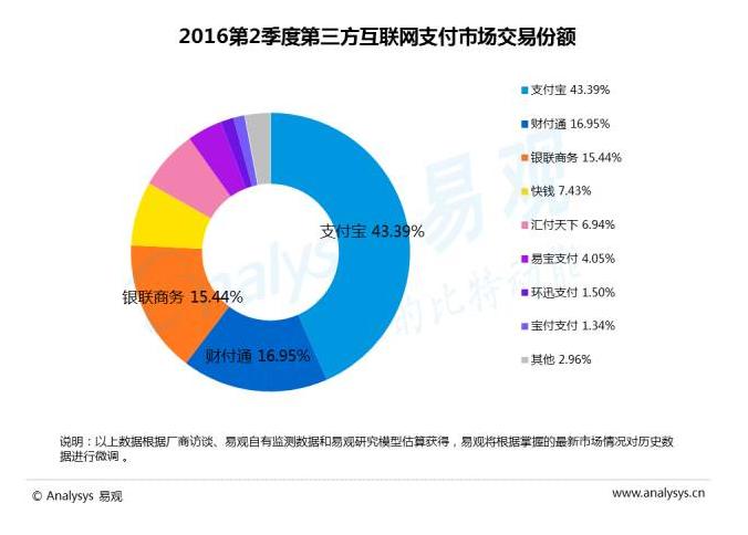 易观发布的研究报告显示,2016年第二季度中国第三方支付互联网支付市场交易规模46500亿元,支付宝、财付通、银联商务仍然占据前三位,支付宝以市占率43.39%位居榜首。