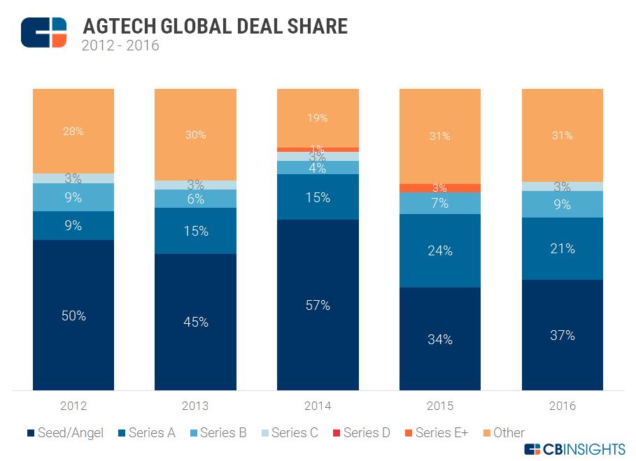 从投资阶段来看,2012年到2014年,农业科技行业的大多数投资交易活动发生在种子/天使阶段。2014年,全球农业科技行业种子/天使阶段的投资份额占总投资交易的一半以上。2014年之后,种子/天使阶段的投资交易份额大幅下降,在过去两年中仅占所有交易的约三分之一。随着行业开始走向成熟,A轮和B轮投资一直在增长。2016年,A轮和B轮投资共占全球行业总投资交易份额的30%。