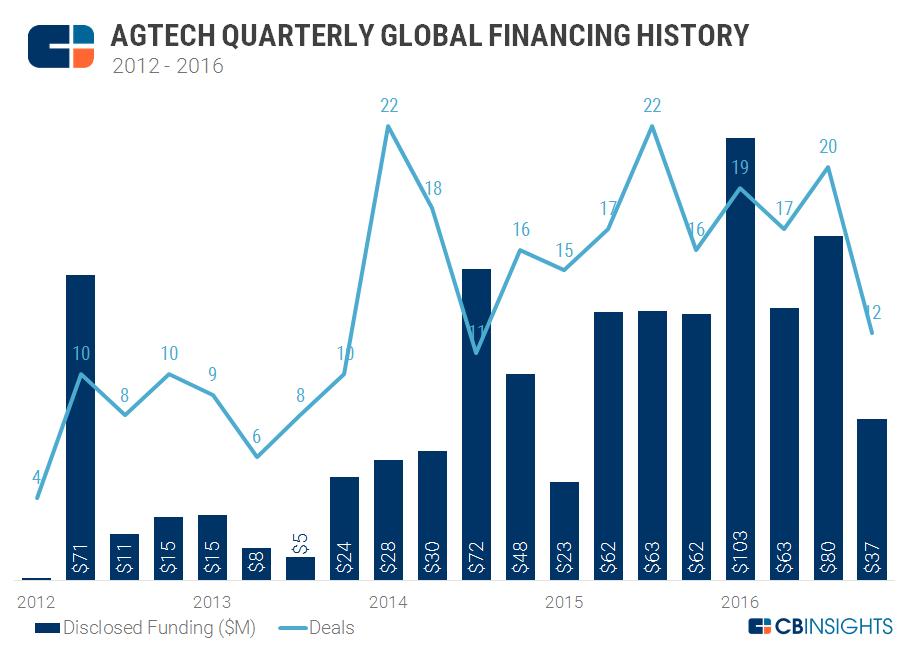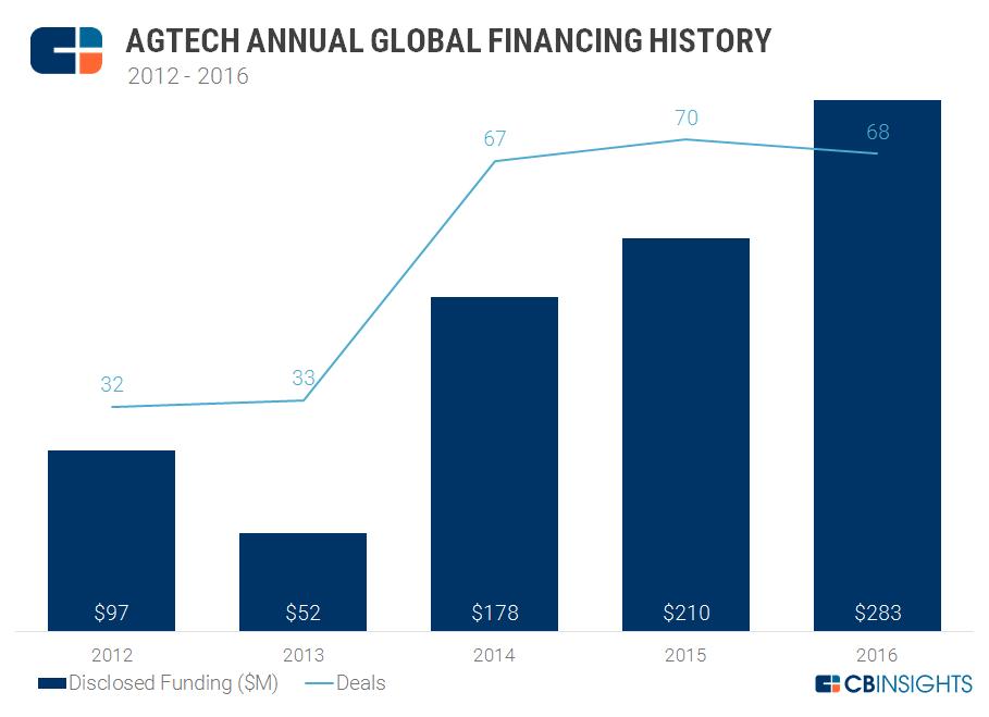 2016年出现些许下滑的原因有两个。首先,由于英国退欧、美国选举和中国经济放缓,整个全球风投市场投资额下降,也连累到了农业科技领域的投资。其次,风投认为2015年该领域投资过热,因而出现了一些观望情绪。