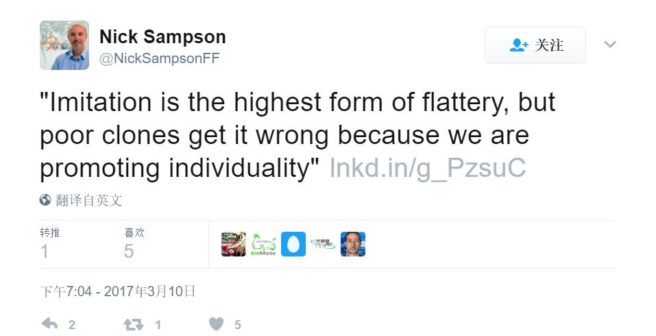 当地时间下午七点,Faraday Future的副总裁Nick Sampson发布Twitter表示:“模仿是最好的致敬,可拙劣的克隆(把设计)全搞错了,我们才是在引领潮流。”同时还附上了一组年初CES展上发布的FF91与蔚来eve设计对比图,如下: