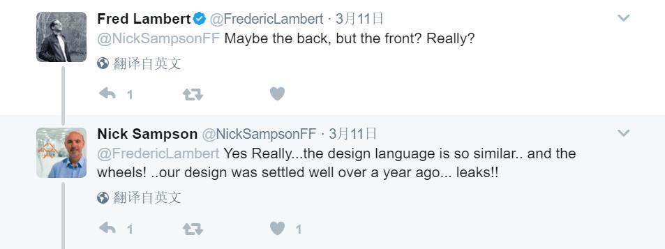 国外一位汽车编辑Fred Lambert向Sampson提问:“两车的尾部似乎有点像,但前脸?你确定?”然而Sampson斩钉截铁的回应:“确定,设计语言实在是太像了,还有轮毂造型!我们的(FF91)设计在一年前的定型了,被泄露了!”