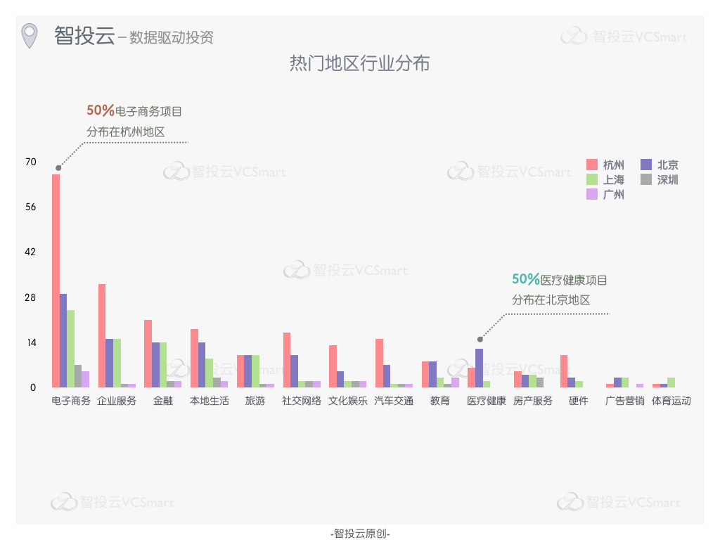 值得注意的是,医疗健康领域,阿里系项目近50%集中在北京地区,这恐怕与北京丰富的医疗资源和专业人才有关。