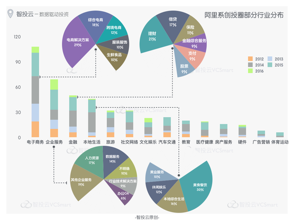 而2015年则是跨境电商占比最多。值得我们注意的是,电商解决方案在每一年的占比都不低。这很可能是因为作为阿里的员工,这些创业者深谙电商之道,他们离开阿里之后也愿意为电商行业做基础设施建设,所以每年都会涌现一批电商解决方案类项目。