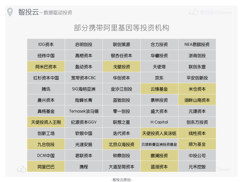 在智投云收录1251起融资事件中,涉及机构320家,根据投资事件数量智投云选取了前60家,并且对部分携带阿里因子(特指投资团队中有1名或1名以上阿里人的机构)的投资机构进行了标注。