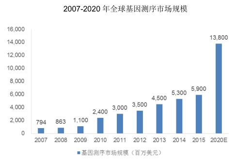 过去几年,基因测序市场发展迅速。据 BCC Research 数据显示,全球基因测序市场总量从 2007 年的 7.94 亿美元增长到 2015 年的 59亿美元,预计未来几年依旧会保持快速增长,2020 年将达到 138 亿美元,年复合增长率为 18.7%。