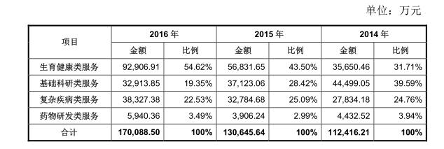 公司的业务主要分为四块:华大基因营收主要分为生育健康类服务、基础科研类服务、复杂疾病类服务,药物研发类服务。其中,生育健康类服务占比最高,2016年收入达9.29亿元,占比54.62%。
