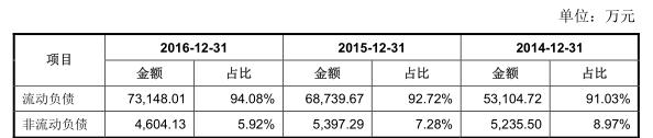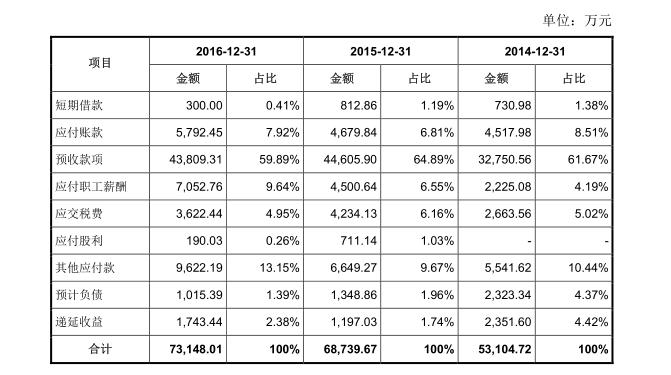 流动负债整体占比稳定,均在90%以上,报告期内流动负债主要为预收款项与其他应付款。非流动负债低于10%,负债状况总体良好。