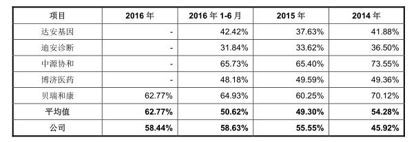 华大基因综合毛利率与同行业的对比