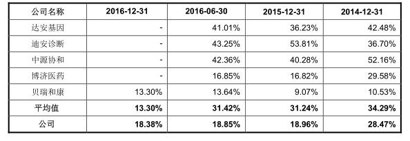 整体来看,2014年到2016年前半年,华大基因综合毛利率都高于行业平均水平,优于多数选手,但是低于其基因检测领域的最大竞争对手贝瑞和康。