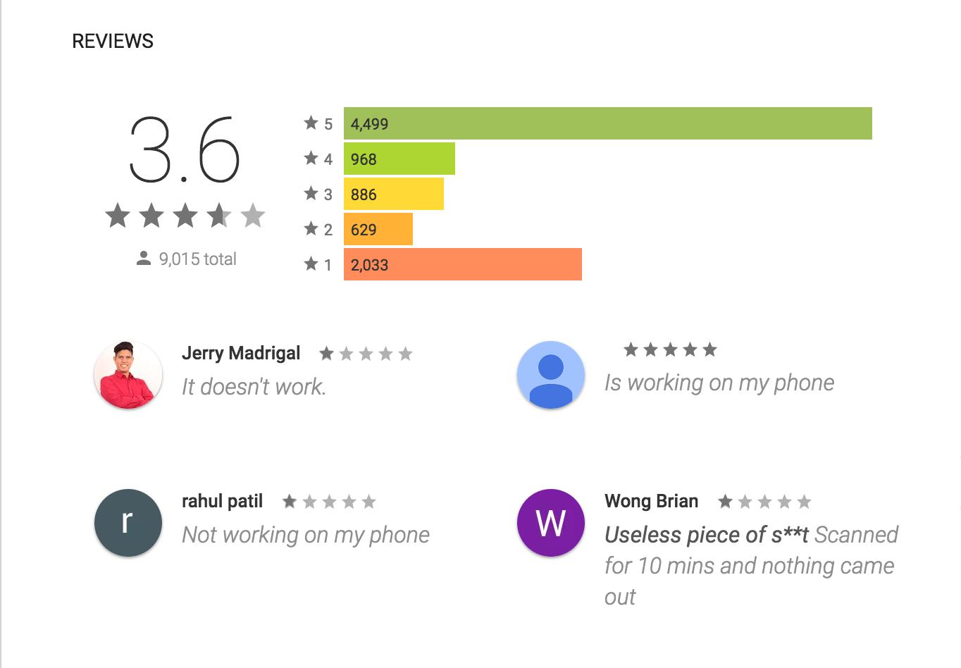 而在安卓系统下的Google Play中,一共有9015人对这款app进行了评分,整体给出了3.6分的评价。