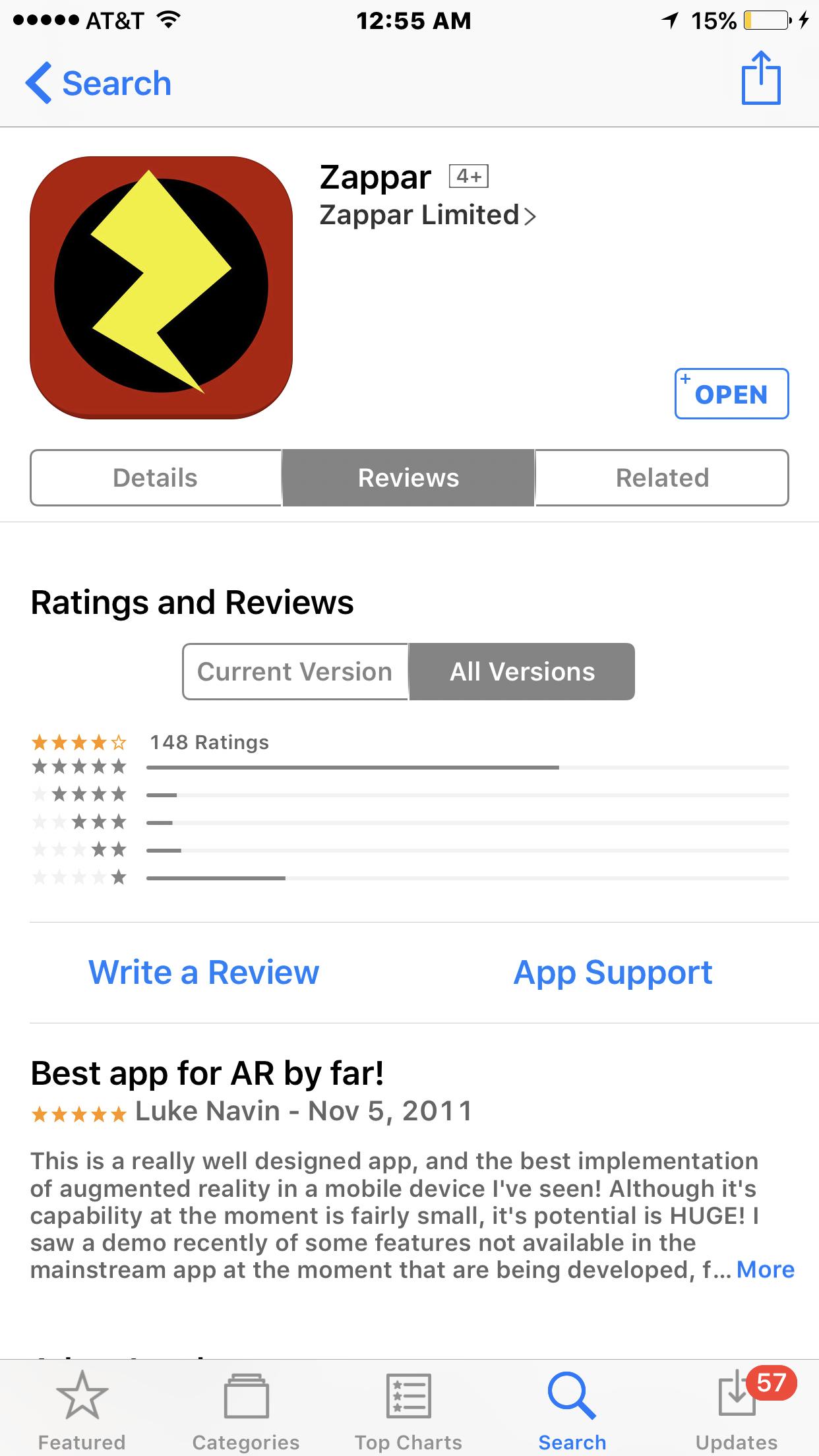 苹果APP Store对于Zappar的评价,截图中评论认为Zappar是迄今为止最好的AR app