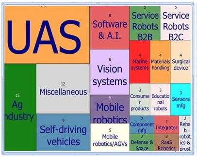 对于获得投资的公司在机器人行业的细分领域分布,下图列出了各领域获得融资的初创公司数量。其中,数目最多的为无人驾驶飞行器领域,共计25家公司获投,其次是农业机器人、商用服务机器人、家用服务机器人、视觉系统开发、自动驾驶、移动机器人和AGVs公司。
