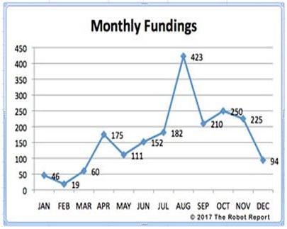下图为The Robot Report发布的月度统计,数据显示2016年全年中,8月分达投资金额最高点,之后有所下降。