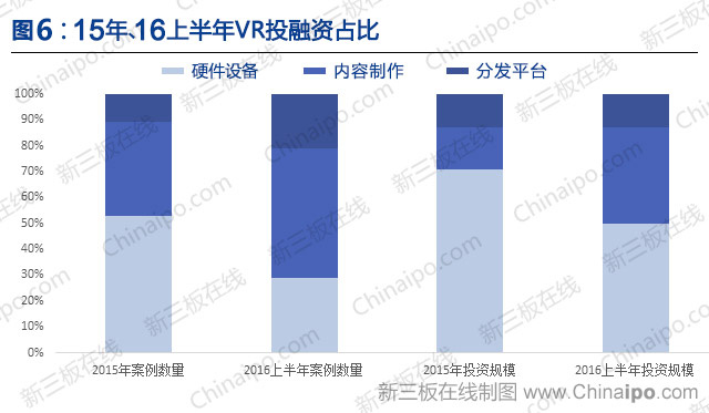 根据投中研究院统计,2015年从案例数量上来说,硬件设备方面投资占比为53%,内容制作为36%,分发平台为11%;而2016年上半年,硬件设备方面投资占比已降至29%,内容制作和分发平台分别上升至50%和21%;从投资规模上来看,内容制作则从16%上升至37%。