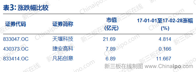 新三板在线研究中心统计了2017年元旦至今新三板中三只重点VR概念股的涨跌表现。通过比较,天堰科技、捷安高科、凡拓创意的平均涨幅为5.549%,其中凡拓创意的涨幅最高,达到11.667%。整体平均表现优于同期A股的指数表现。