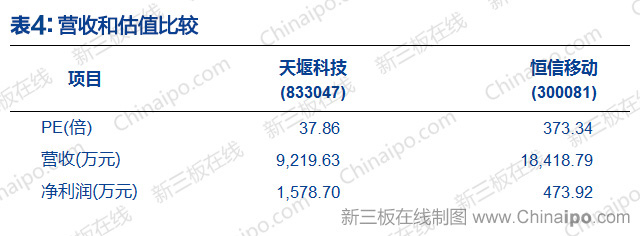 从表中数据可见,据两者2016上半年报,天堰科技的估值约为恒信移动的十分之一,其营收约为后者的二分之一,但净利润却约为后者的三倍。