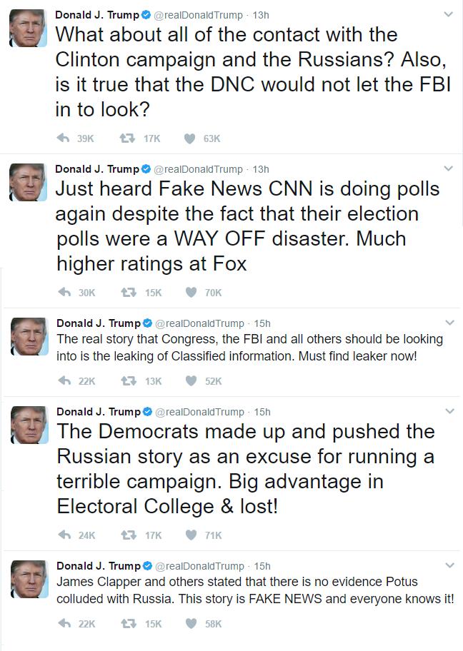 然后,Twitter治国的总统大人知道听证会的事之后,自然就开始在Twitter上发表态度。比如“自己总统竞选没做好就开始说我和俄罗斯人有关系,你low不low?”、“怎么不调查一下希拉里团队和俄罗斯人的关系呢?”嗯,具体原文大家可以看下面:
