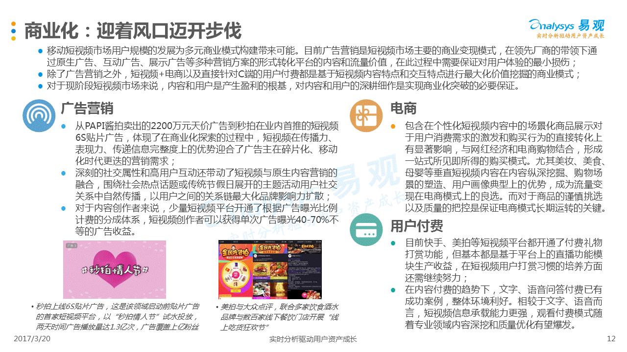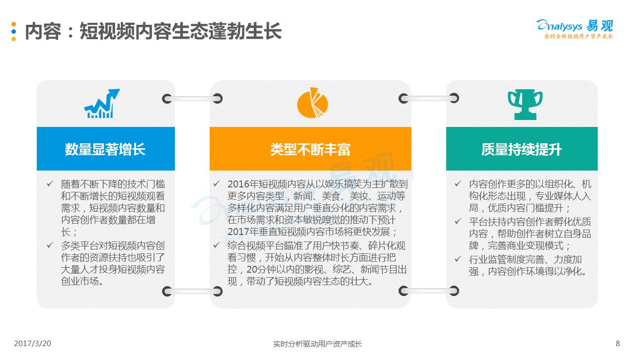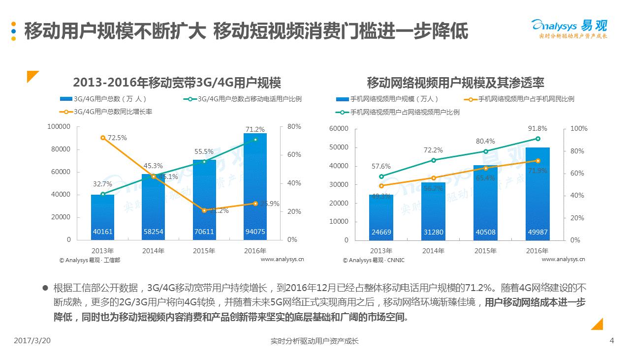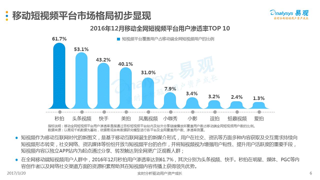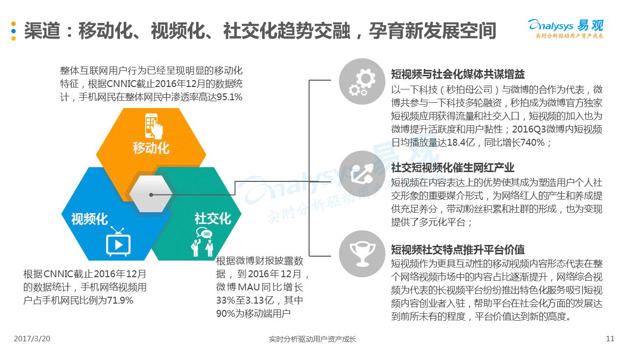 2016年,移动互联网用户对移动视频内容消费持续发酵,其中以移动短视频尤为引人注目。短视频全网覆盖用户规模不断攀升,为移动互联网带来巨大流量,同时也为优质短视频平台及内容创业者获得巨额融资形成支撑,并为其商业化探索提供助力。本次专题分析将从发展现状、典型企业、未来趋势等方向对中国移动短视频市场做分析解读。