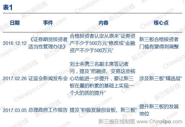 通过上表列举的事件可以看到,管理层对新三板的关注度越来越高。仅在过去的四个月中就连续三次在重大文件或报告中涉及新三板内容。