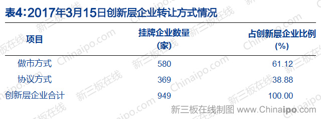 而在949家创新层企业之中按照股票转让方式,又可分为“做市方式”和“协议方式”两种转让方式。