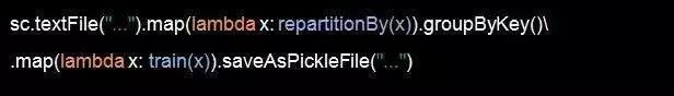 repartitionBy方法即设置一个重分区的逻辑返回(K,V)结构RDD,train方法是训练数据,在train方法里面会调用Python算法包接口。saveAsPickleFile是Spark Python独有的一个Action操作,支持将RDD保存成序列化后的sequnceFile格式的文件,在序列化过程中会以10个一批的方式进行处理,保存模型文件非常适合。