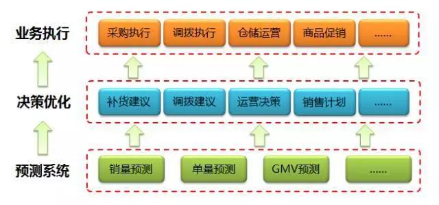 预测系统在整个供应链体系中处在最底层并且起到一个支撑的作用,支持上层的多个决策优化系统,而这些决策优化系统利用精准的预测数据结合运筹学技术得出最优的决策,并将结果提供给更上层的业务执行系统或是业务方直接使用。
