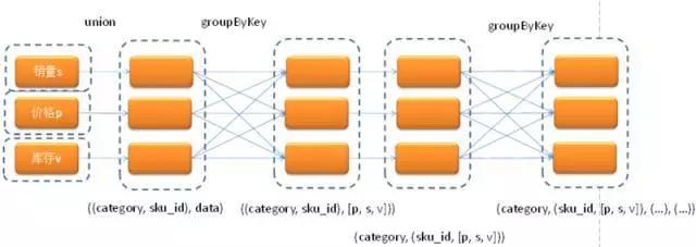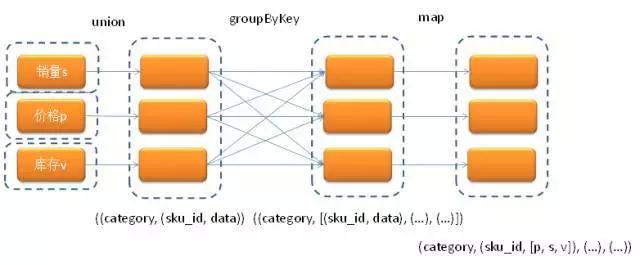 业务逻辑是这样的:我们有三张表分别是销量(s)、价格(p)、库存(v),每张表有3个字段:商品id(sku_id)、品类id(category)和历史时序数据(data),现在需要按sku_id将s、p、v数据合并,然后再按category再合并一次,最终的数据格式是:[category,[[sku_id, s , p, v], [sku_id, s , p, v], […],[…]]]。一开始我们先按照sku_id + category作为key进行一次groupByKey,将数据格式转换成[sku_id, category , [s,p, v]],然后按category作为key再groupByKey一次。