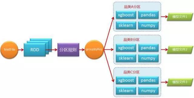 我们实现的方法很简单,首先需要在集群的每个节点上安装所需的全部Python包,然后在编写Spark程序时考虑通过某种规则将数据分区,比如按品类维度,通过groupByKey操作将数据重新分区,每一个分区是一个样本集合并进行独立的训练,以此达到并行化。流程如下图所示: