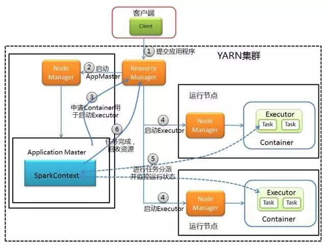 第一个阶段是把Spark的SparkContext作为Application Master在YARN集群中先启动;第二个阶段是由Application Master创建应用程序,然后为它向Resource Manager申请资源,并启动Executor来运行任务集,同时监控它的整个运行过程,直到运行完成。下图为Yarn-Cluster运行模式执行过程: