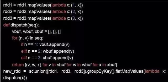 多表join时,如果key值相同,则可以使用union+groupByKey+flatMapValues形式进行。比如:需要将销量、库存、价格、促销计划和商品信息通过商品编码连接到一起,一开始使用的是join转换操作,将几个RDD彼此join在一起。后来发现这样做运行速度非常慢,于是换成union+groypByKey+flatMapValue形式,这样做只需进行一次Shuffle,这样修改后运行速度比以前快多了。实例代码如下: