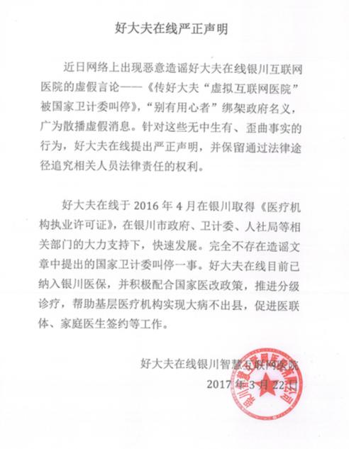 好大夫方面在第一时间做出了回应,指斥该文造谣,且“别有用心”。好大夫在声明中称“好大夫在线于2016年4月在银川取得《医疗机构执业许可证》,在银川市政府、卫计委、人社局等相关部门的大力支持下,快速发展。完全不存在造谣文章中提出的国家卫计委叫停一事。”
