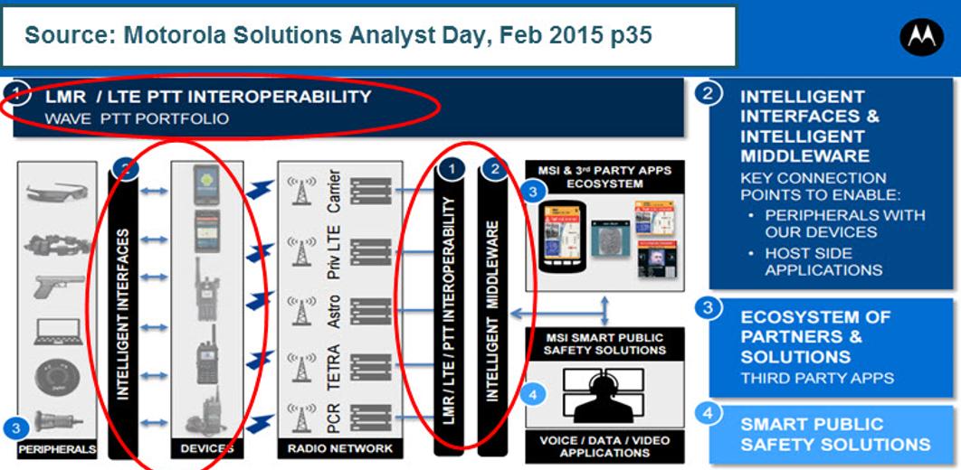 在关键通信设备市场,摩托罗拉已经是领导者,它的市场地位因为软件和服务得以巩固,软件和服务可以将传统地面移动无线电(LMR)网络与LTE网络、设备、应用整合。摩托罗拉采用的平台、生态系统策略与苹果在3G/4G领域采用的策略相似,与诺基亚在2G环境中采用的功能手机策略类似。