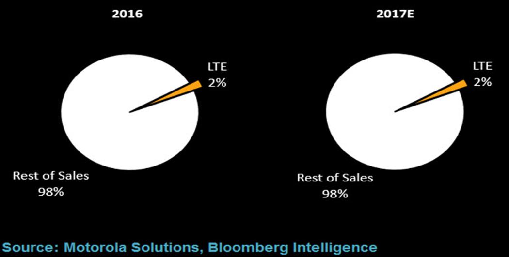 由于没有全国性的PS LTE网络,所以摩托罗拉及同行的LTE设备销量受到了限制。2016年,摩托罗拉PS-LTE销售额约为1.4亿美元,占了总营收的2%,2017年的目标差不多。