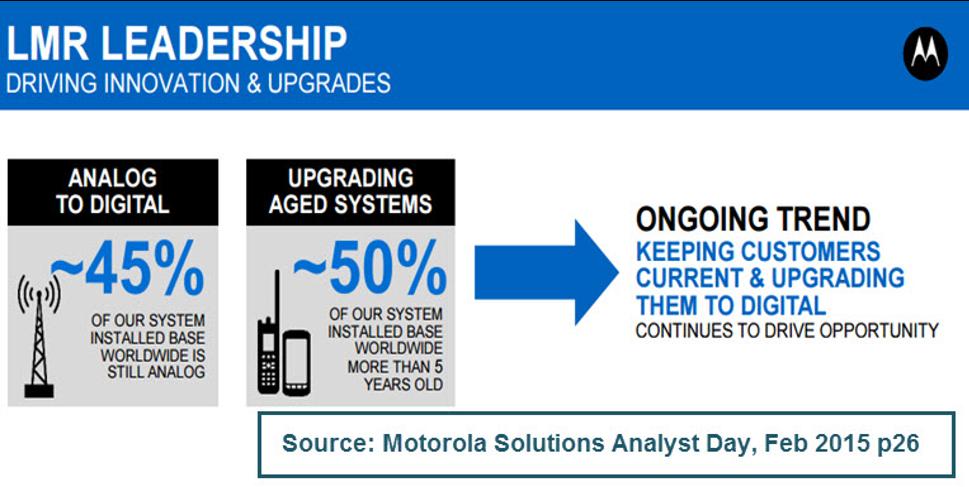 目前摩托罗拉的安装基数约40%甚至更多使用的都是传统模拟无线电技术,也就是说升级到数字无线电(比如P25、Tetra)可以带来很大的机会。