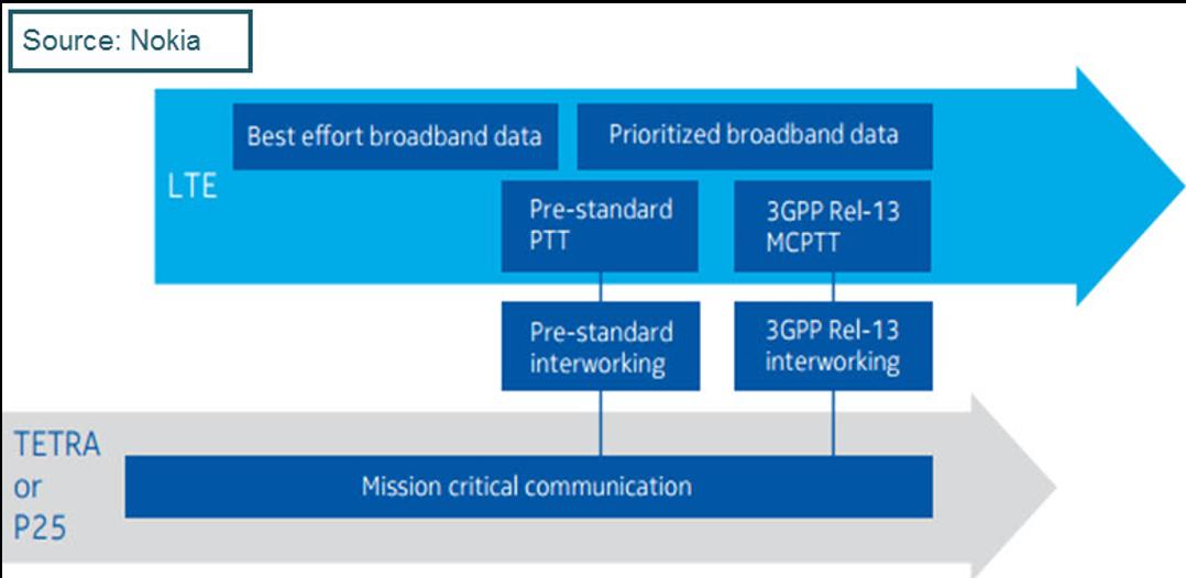 正如商用市场从3G向4G过渡一样,PS-LTE将会成为现有数字、模拟地面移动无线电网络的补充。老网络退役时我们会以许多年为单位来衡量,因为设备的数量很大,而且通信网络具有一些关键特点。